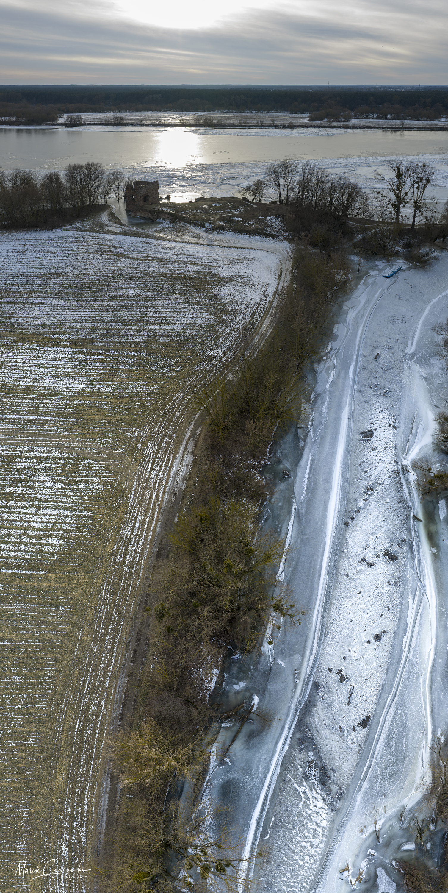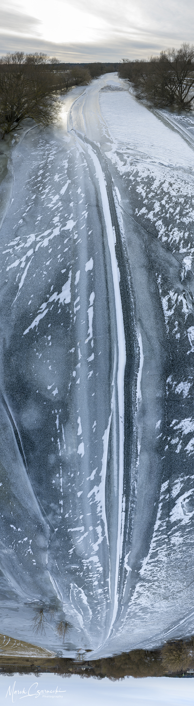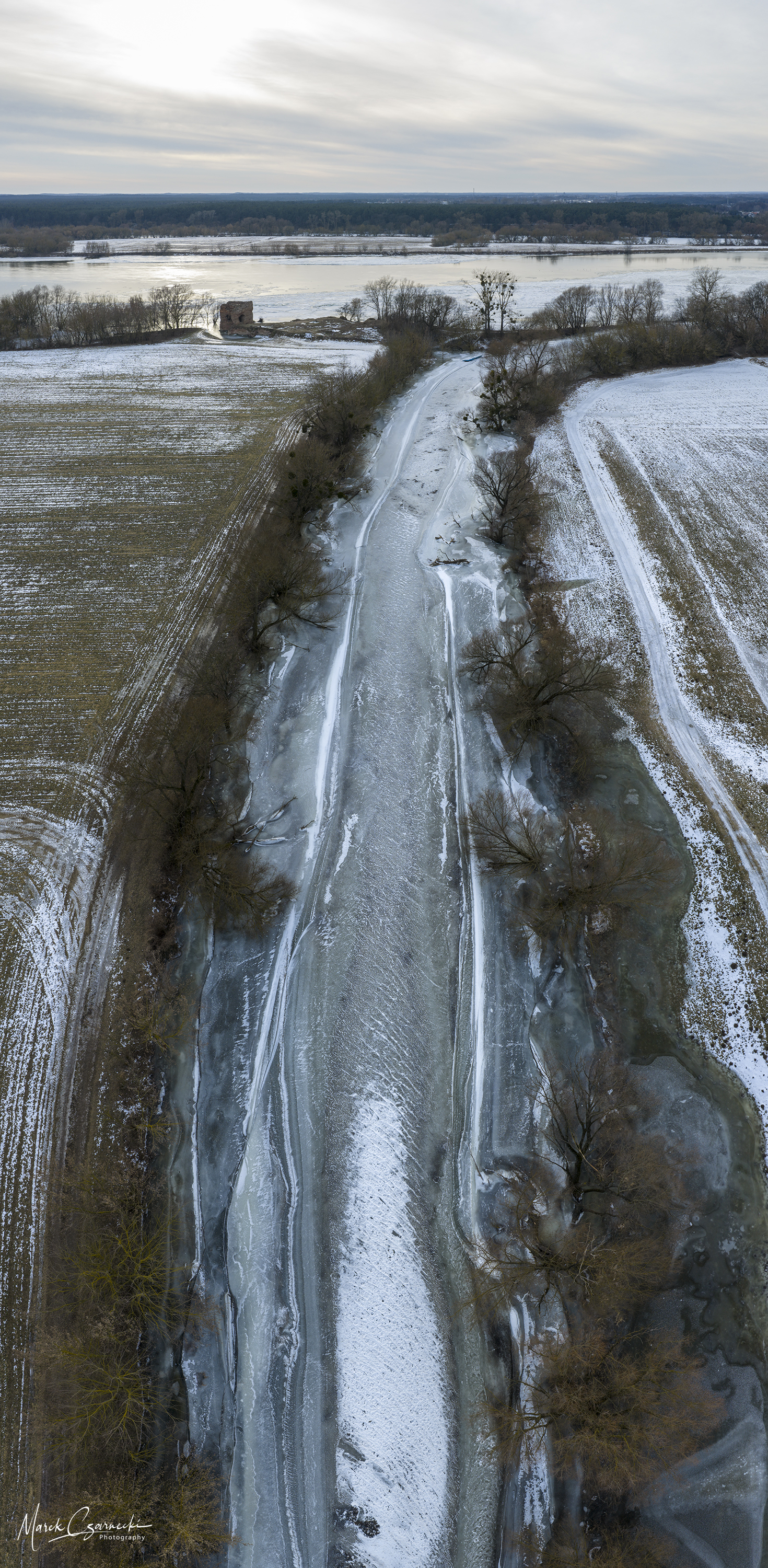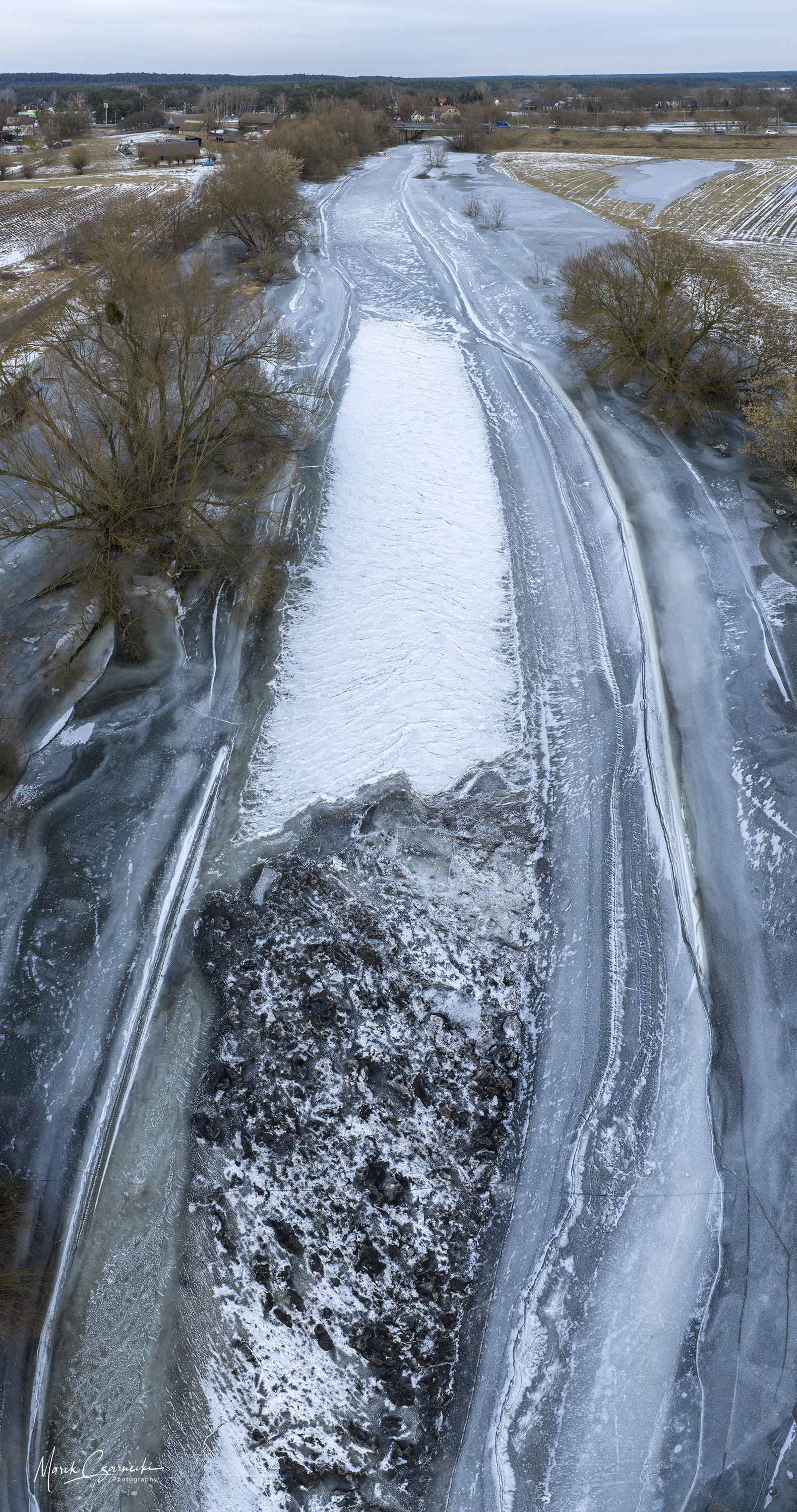 Szczególne miejsce w tym zbiorze zajmują ujęcia wykonane w dniach największych mrozów – kiedy Drwęca, skuta lodem, nieruchomieje, tworząc niezwykłe, geometryczne tekstury, które można dostrzec jedynie z drona.