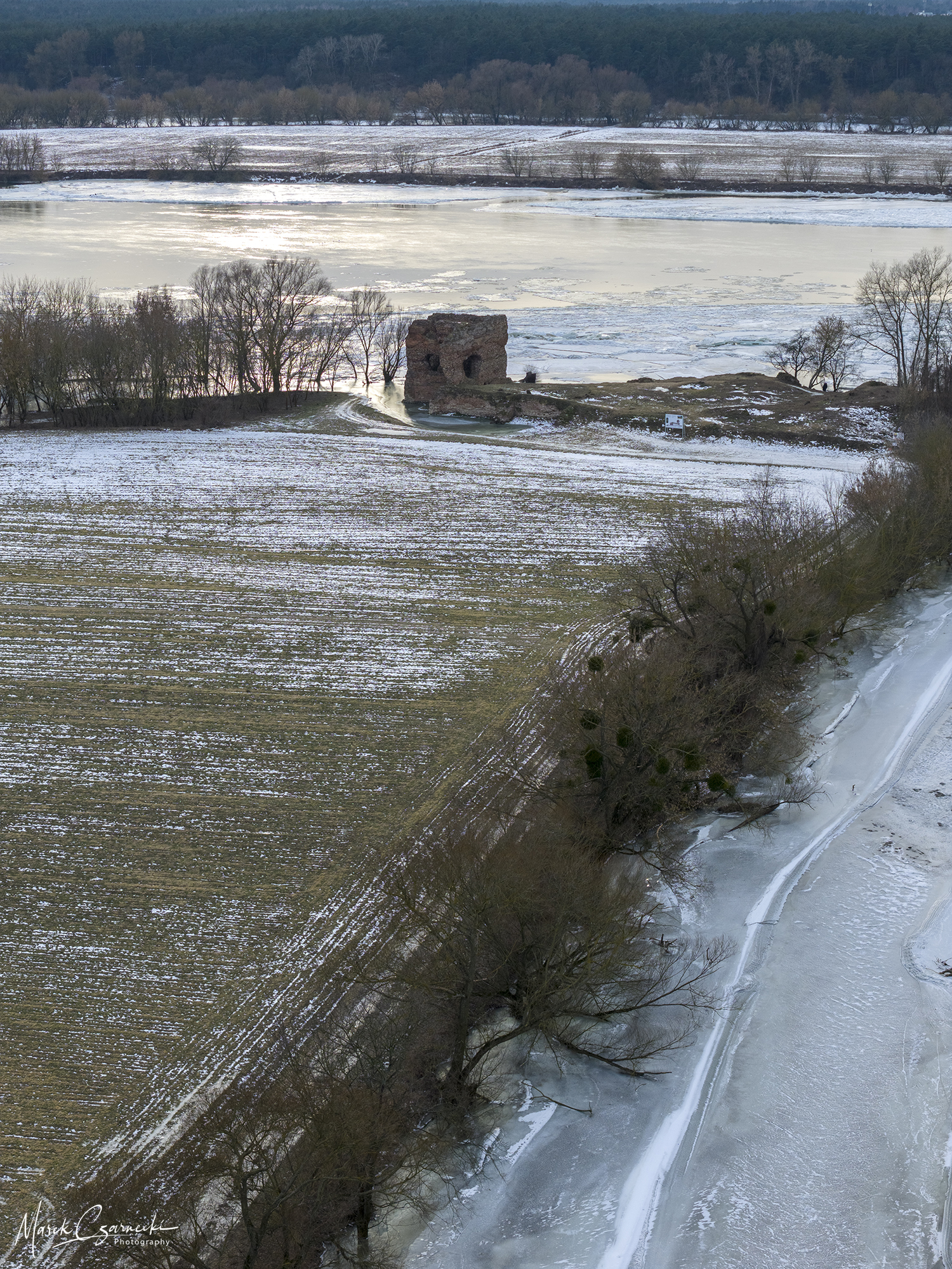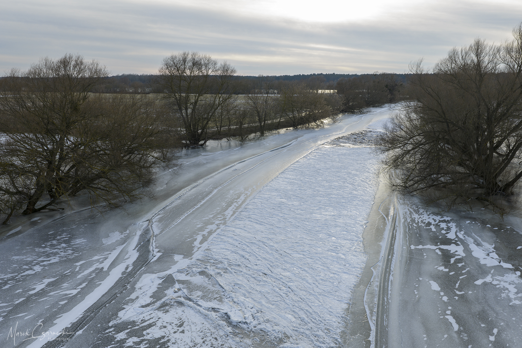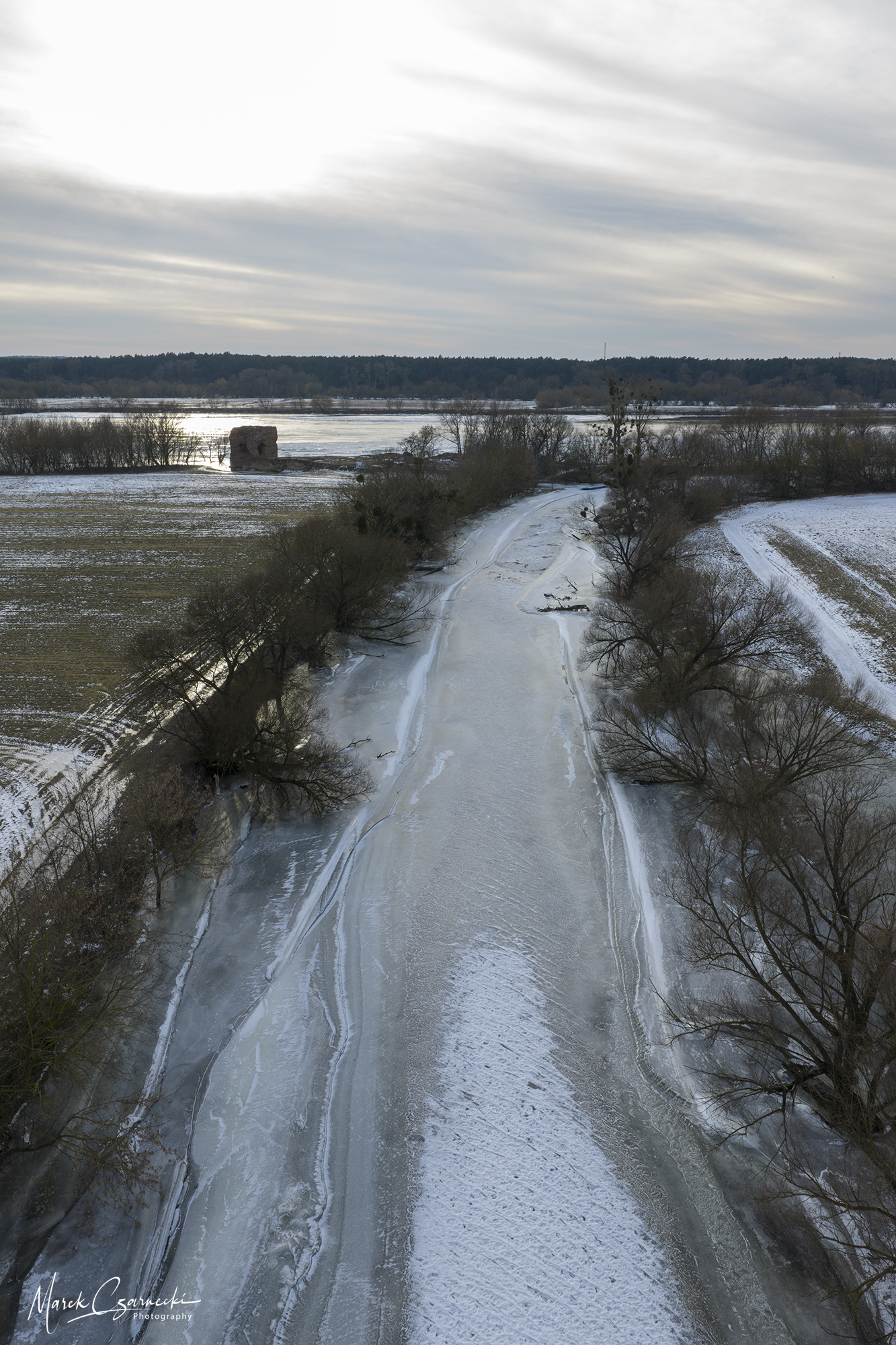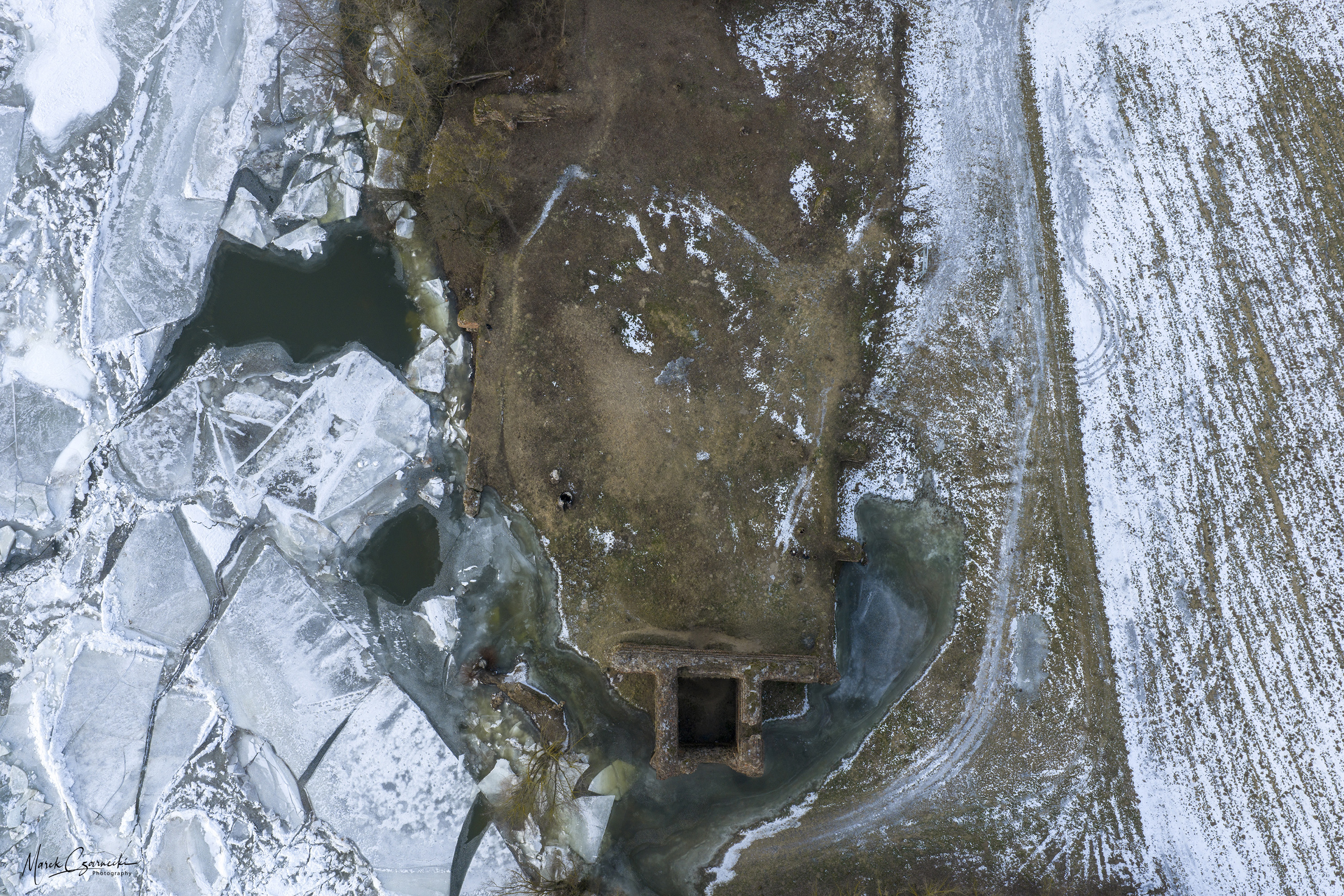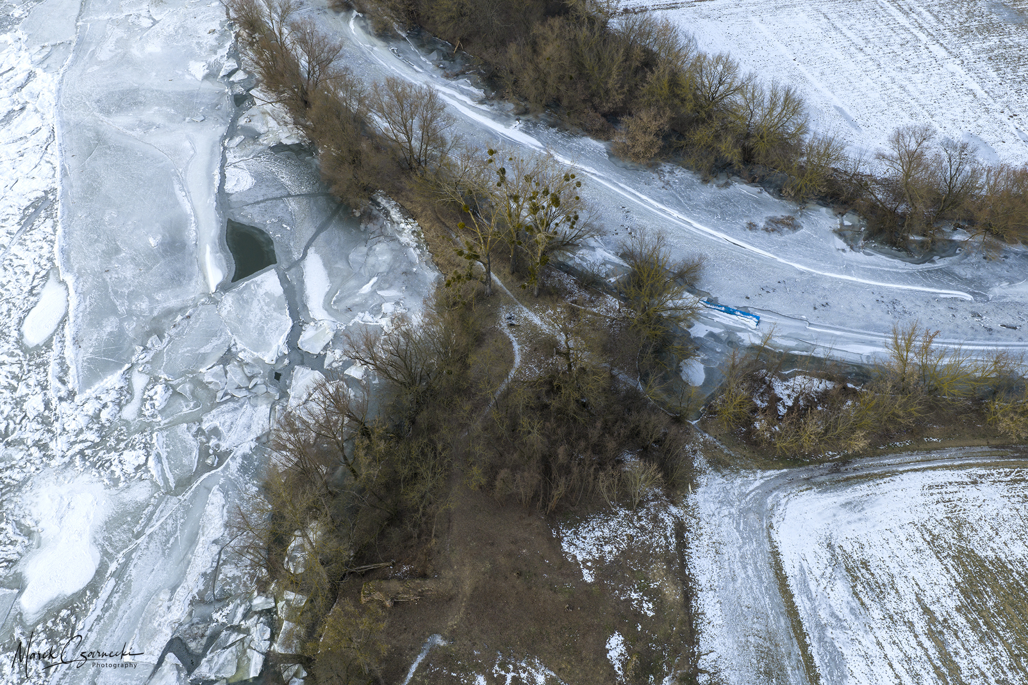 Szczególne miejsce w tym zbiorze zajmują ujęcia wykonane w dniach największych mrozów – kiedy Drwęca, skuta lodem, nieruchomieje, tworząc niezwykłe, geometryczne tekstury, które można dostrzec jedynie z drona.