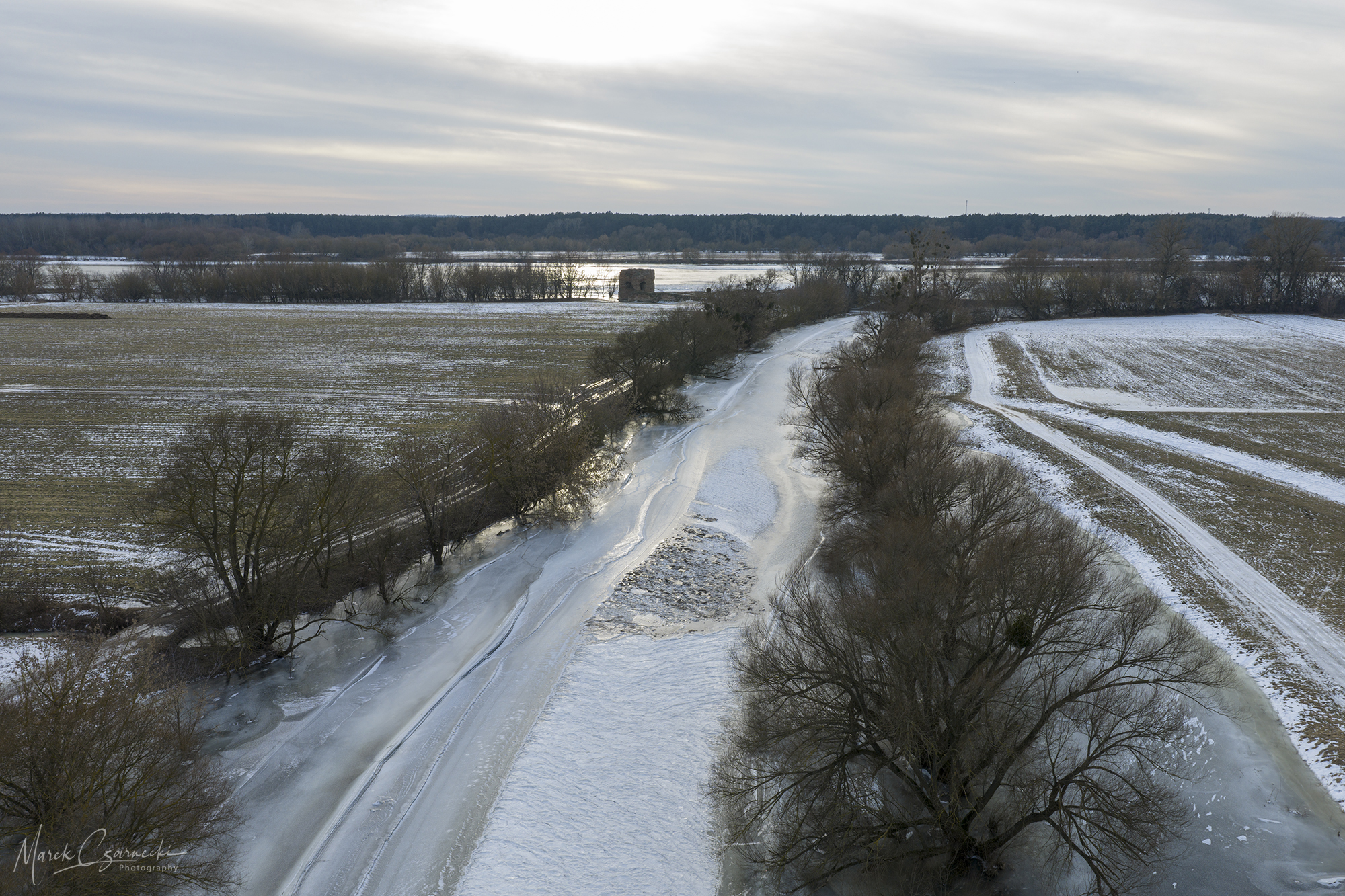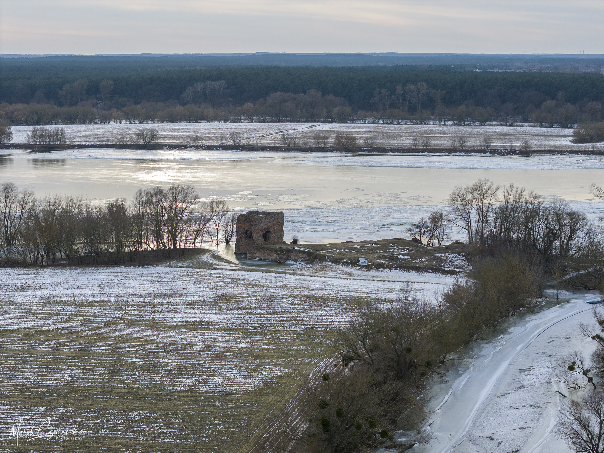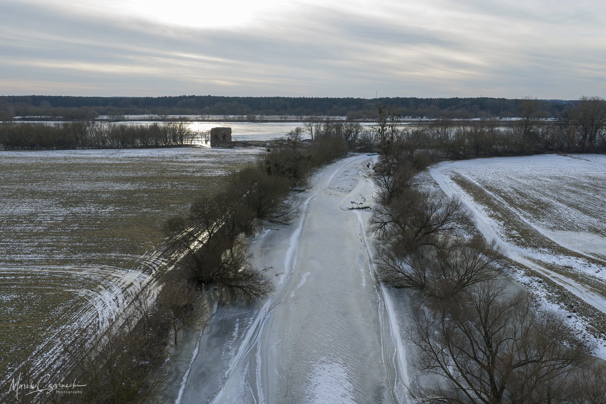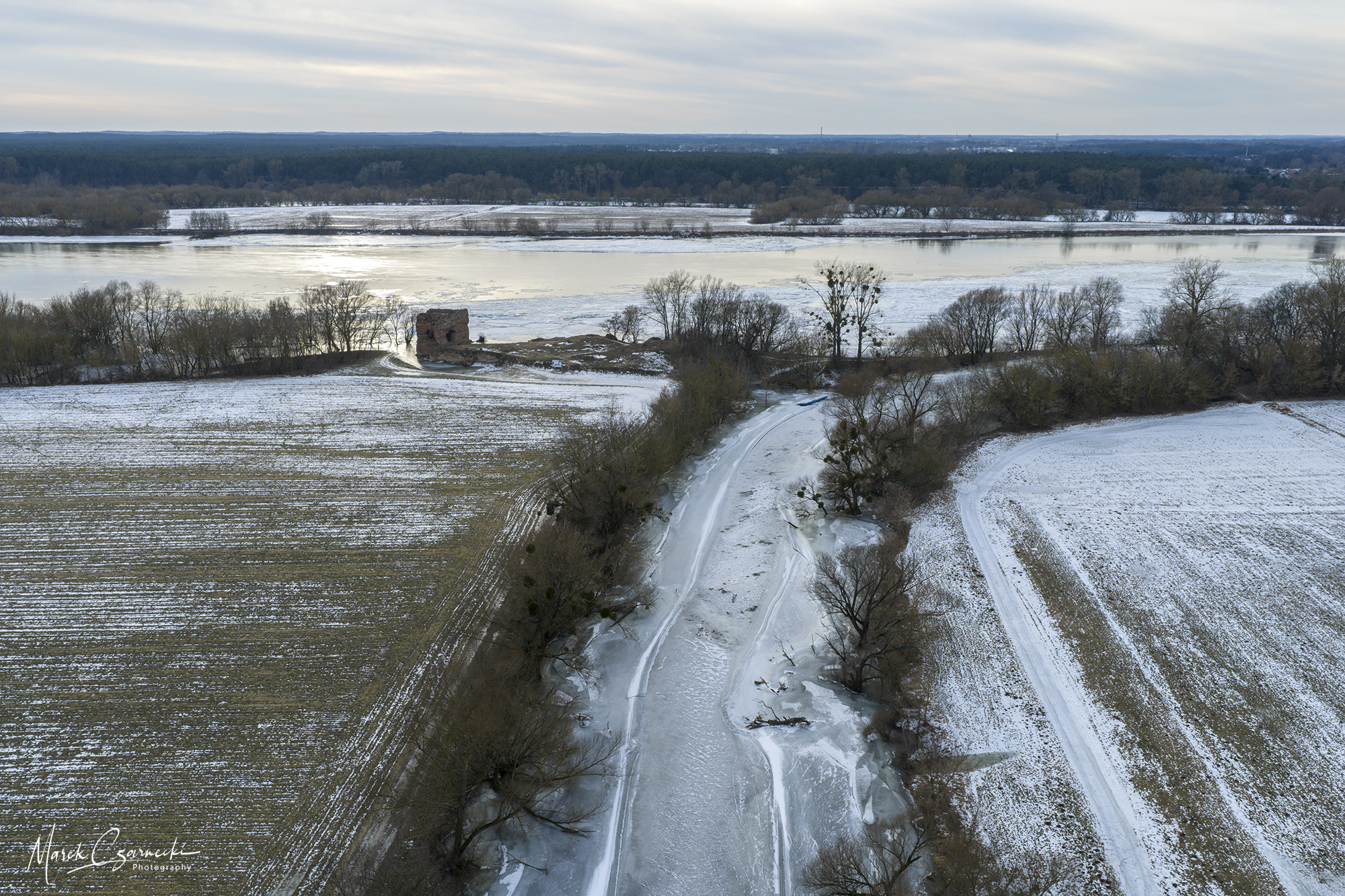 Szczególne miejsce w tym zbiorze zajmują ujęcia wykonane w dniach największych mrozów – kiedy Drwęca, skuta lodem, nieruchomieje, tworząc niezwykłe, geometryczne tekstury, które można dostrzec jedynie z drona.